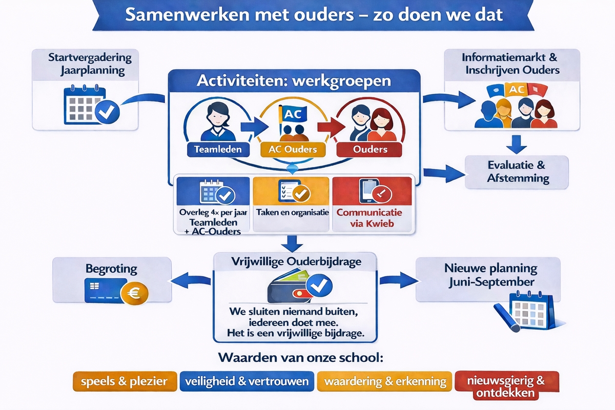 Om deze activiteiten te kunnen organiseren vragen wij een vrijwillige ouderbijdrage.Deze bijdrage is niet verplicht en uw kind(eren) kan gwoon met onze activiteiten meedoen mocht u besluiten om het niet over te maken.